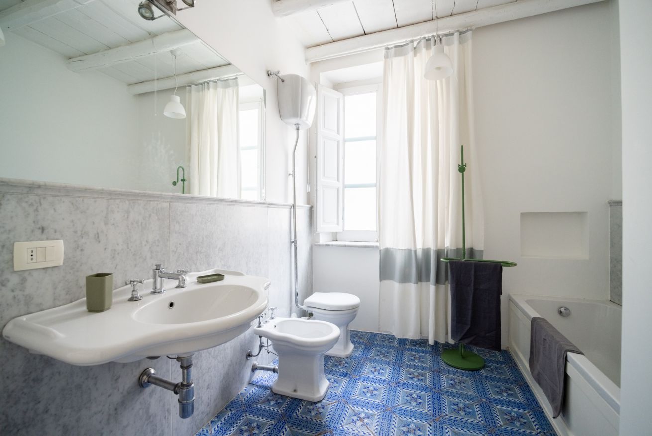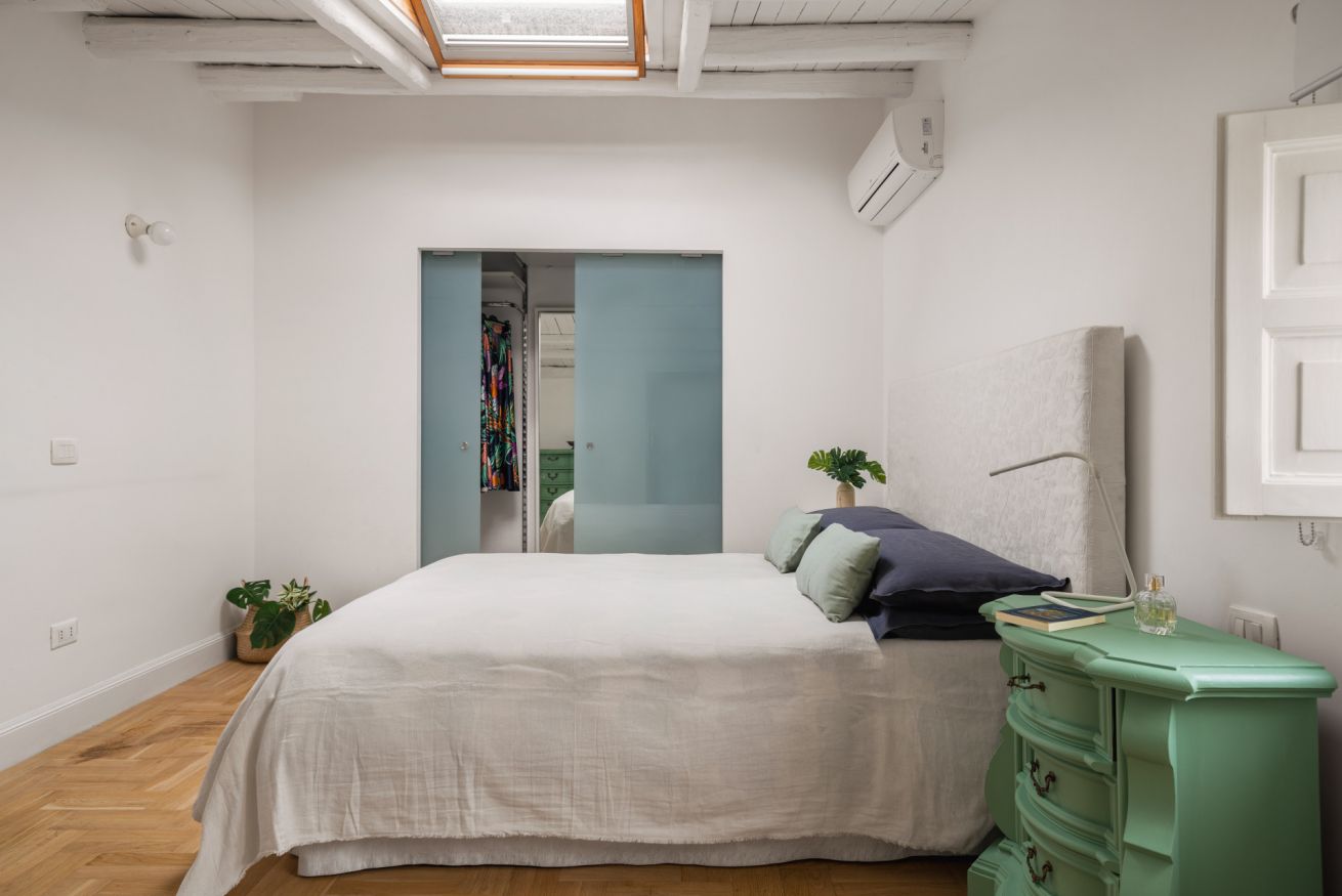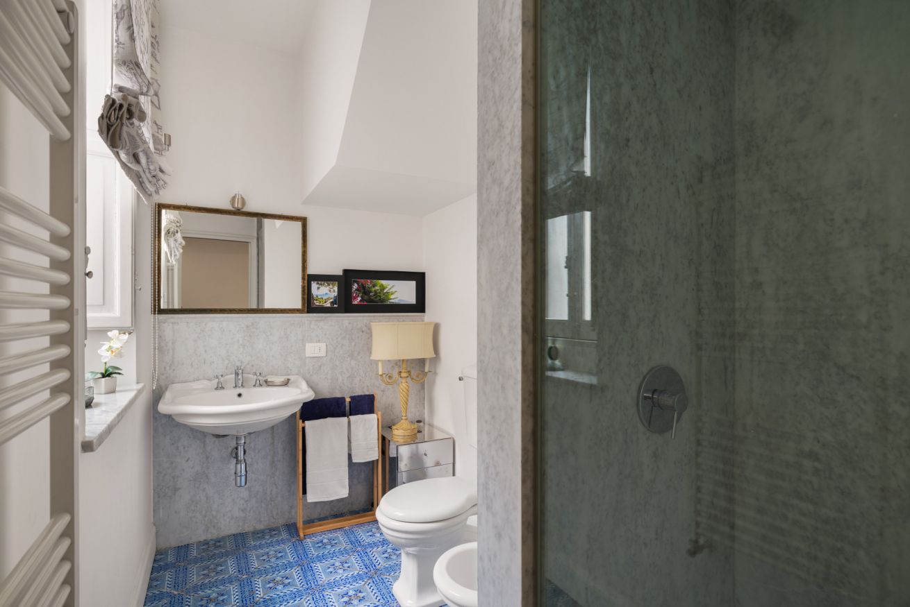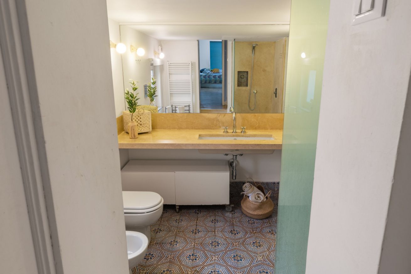 In the name of charm and spaciousness, the Garzilli Deluxe Apartment was designed. A prestigious home not only for its spacious rooms, but also for the materials chosen and used in the best way to enhance its properties. Upon entering, there is an initial hallway leading to the other areas of the house on the same floor and a modern marble staircase leading to the upper floor. Past the entrance, there are two large living rooms, one dedicated to the TV area and one to reading and relaxation, followed by a large dining room adjacent to the eat-in kitchen with an additional dining table. The living rooms are connected and enhanced by elegant enfilades to emphasise their spaciousness and brightness. Continuing from the kitchen you enter a corridor where you will find the first bathroom with a large shower, decorated with beautiful blue tiles, followed by a double bedroom with desk, en-suite bathroom with bathtub and a large and very comfortable walk-in wardrobe. Going upstairs leads to a second area of the house. To the left is a French-style double bedroom with a special skylight, turning to the right one comes to a living room with TV area and reading corner, this room leads to a double bedroom with adjacent large bathroom with shower and laundry corner. A small flight of stairs leads to an intimate and cosy terrace with a brick kitchenette and a splendid view of the city’s colourful rooftops.