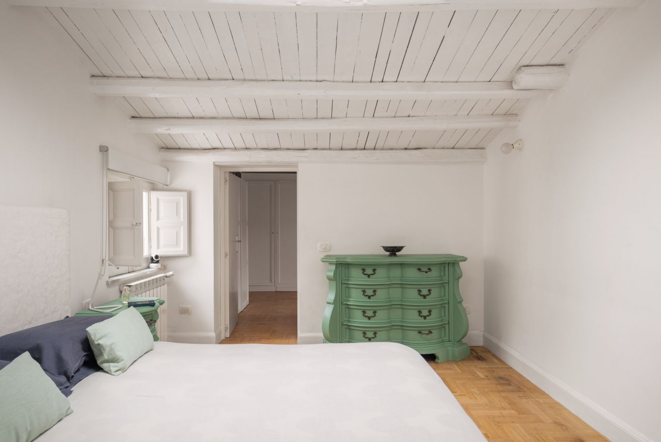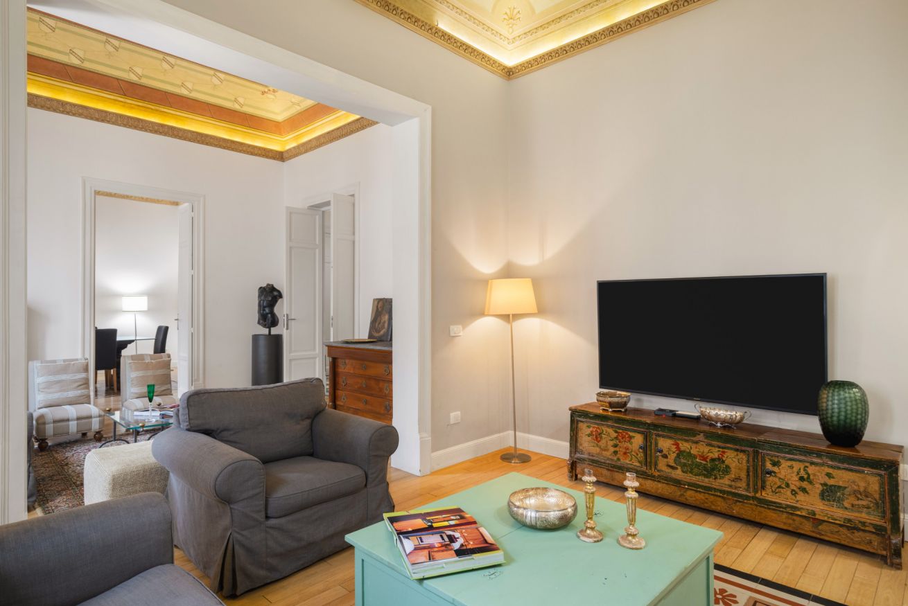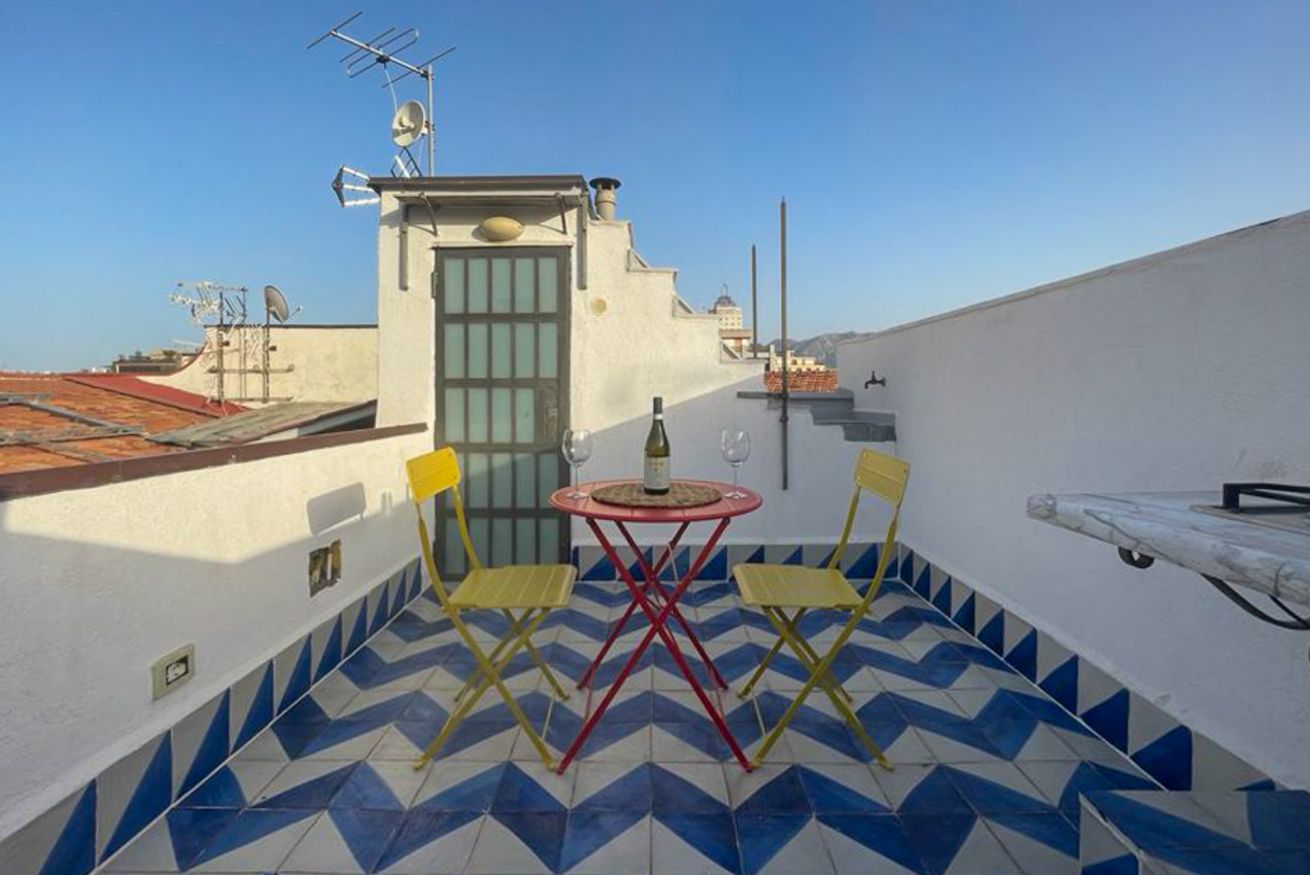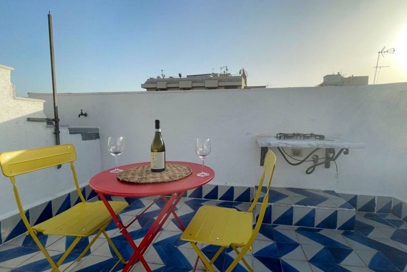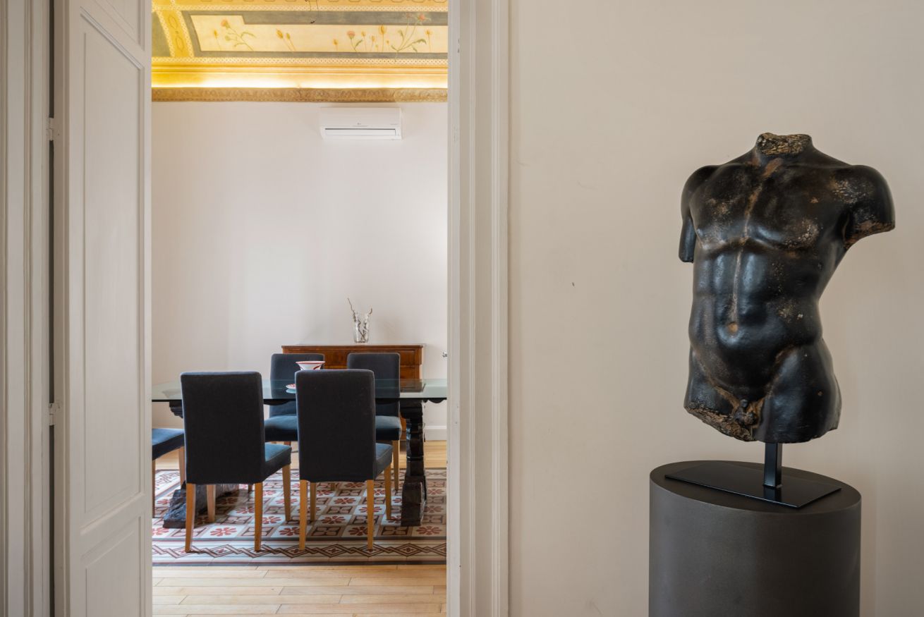 In the name of charm and spaciousness, the Garzilli Deluxe Apartment was designed. A prestigious home not only for its spacious rooms, but also for the materials chosen and used in the best way to enhance its properties. Upon entering, there is an initial hallway leading to the other areas of the house on the same floor and a modern marble staircase leading to the upper floor. Past the entrance, there are two large living rooms, one dedicated to the TV area and one to reading and relaxation, followed by a large dining room adjacent to the eat-in kitchen with an additional dining table. The living rooms are connected and enhanced by elegant enfilades to emphasise their spaciousness and brightness. Continuing from the kitchen you enter a corridor where you will find the first bathroom with a large shower, decorated with beautiful blue tiles, followed by a double bedroom with desk, en-suite bathroom with bathtub and a large and very comfortable walk-in wardrobe. Going upstairs leads to a second area of the house. To the left is a French-style double bedroom with a special skylight, turning to the right one comes to a living room with TV area and reading corner, this room leads to a double bedroom with adjacent large bathroom with shower and laundry corner. A small flight of stairs leads to an intimate and cosy terrace with a brick kitchenette and a splendid view of the city’s colourful rooftops.