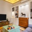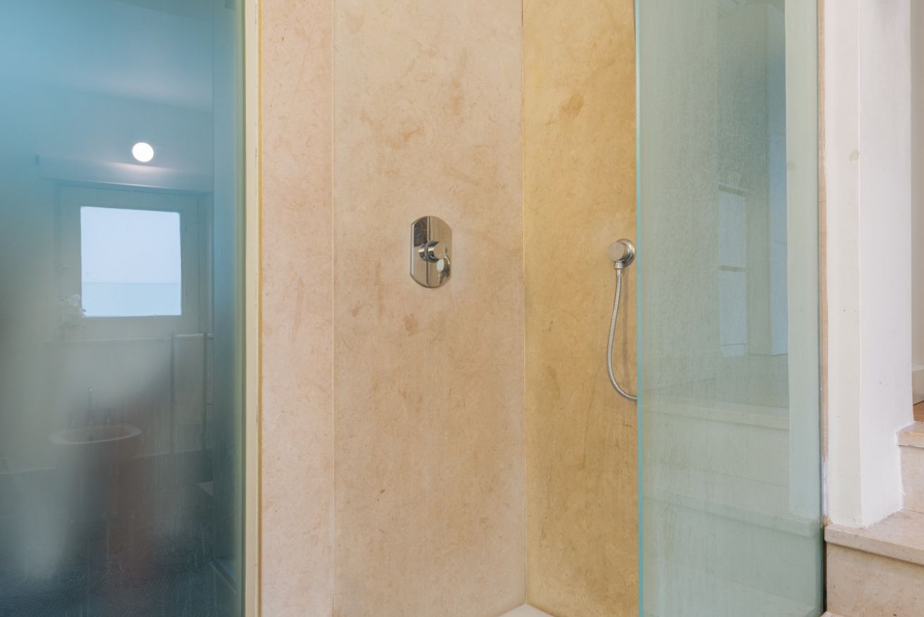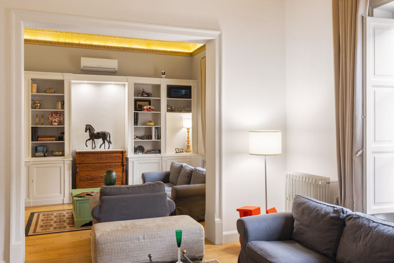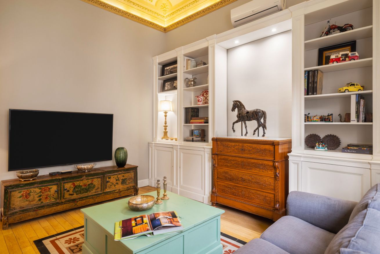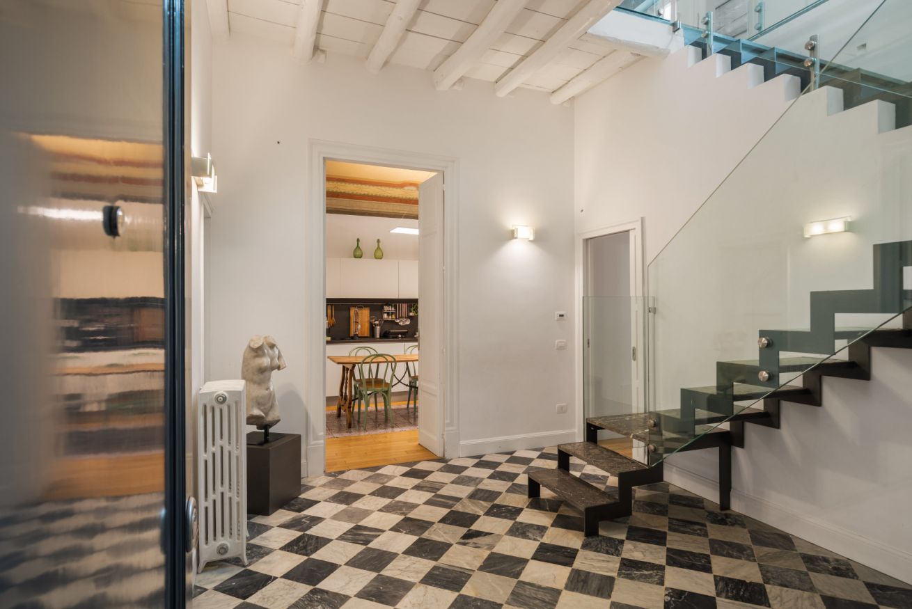 In the name of charm and spaciousness, the Garzilli Deluxe Apartment was designed. A prestigious home not only for its spacious rooms, but also for the materials chosen and used in the best way to enhance its properties. Upon entering, there is an initial hallway leading to the other areas of the house on the same floor and a modern marble staircase leading to the upper floor. Past the entrance, there are two large living rooms, one dedicated to the TV area and one to reading and relaxation, followed by a large dining room adjacent to the eat-in kitchen with an additional dining table. The living rooms are connected and enhanced by elegant enfilades to emphasise their spaciousness and brightness. Continuing from the kitchen you enter a corridor where you will find the first bathroom with a large shower, decorated with beautiful blue tiles, followed by a double bedroom with desk, en-suite bathroom with bathtub and a large and very comfortable walk-in wardrobe. Going upstairs leads to a second area of the house. To the left is a French-style double bedroom with a special skylight, turning to the right one comes to a living room with TV area and reading corner, this room leads to a double bedroom with adjacent large bathroom with shower and laundry corner. A small flight of stairs leads to an intimate and cosy terrace with a brick kitchenette and a splendid view of the city’s colourful rooftops.