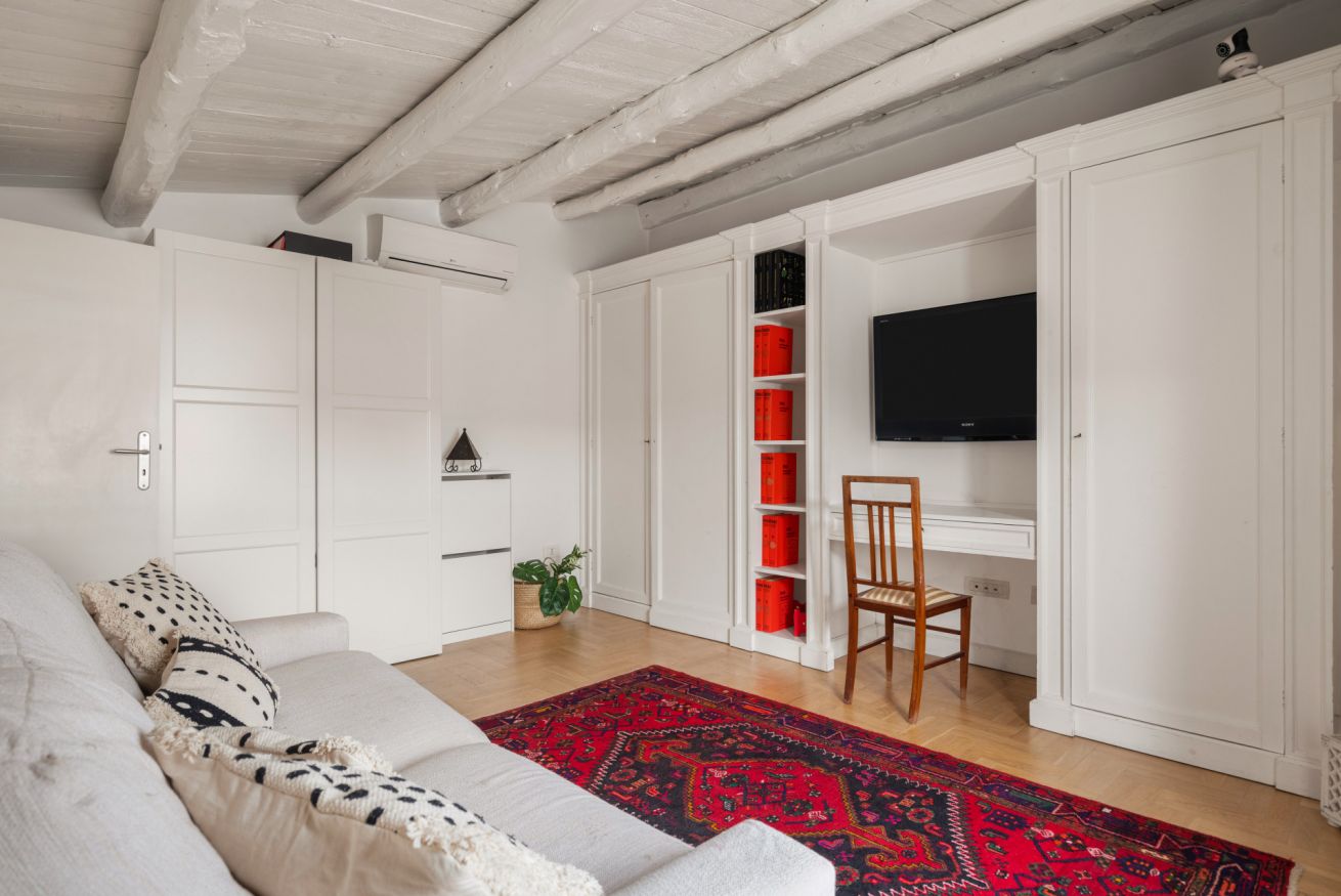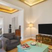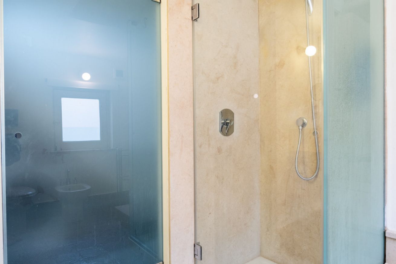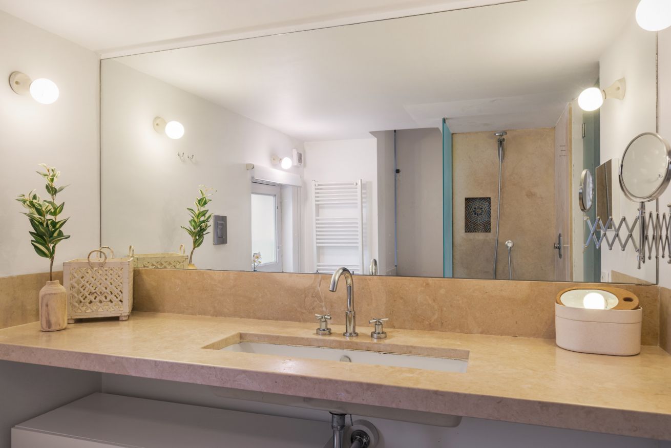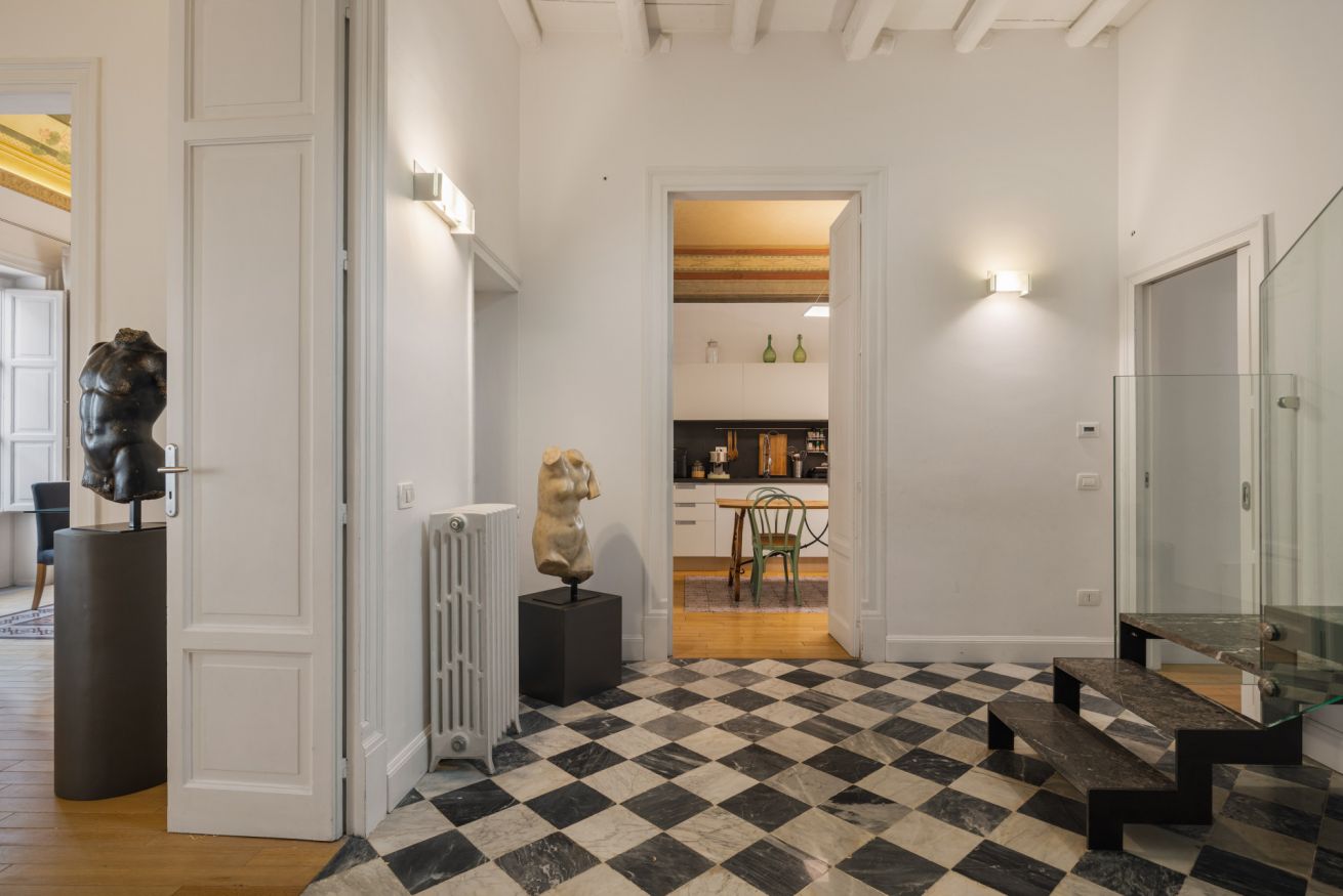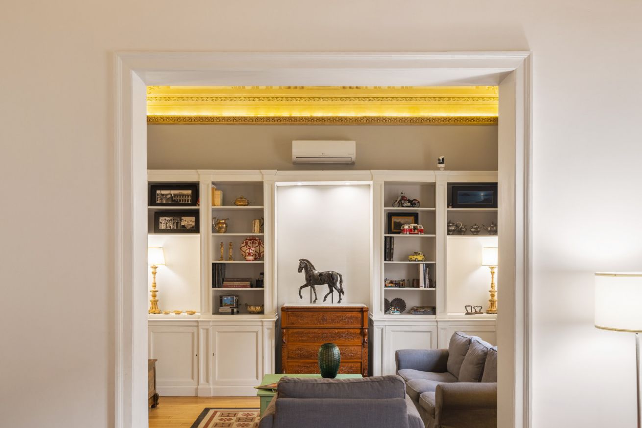 In the name of charm and spaciousness, the Garzilli Deluxe Apartment was designed. A prestigious home not only for its spacious rooms, but also for the materials chosen and used in the best way to enhance its properties. Upon entering, there is an initial hallway leading to the other areas of the house on the same floor and a modern marble staircase leading to the upper floor. Past the entrance, there are two large living rooms, one dedicated to the TV area and one to reading and relaxation, followed by a large dining room adjacent to the eat-in kitchen with an additional dining table. The living rooms are connected and enhanced by elegant enfilades to emphasise their spaciousness and brightness. Continuing from the kitchen you enter a corridor where you will find the first bathroom with a large shower, decorated with beautiful blue tiles, followed by a double bedroom with desk, en-suite bathroom with bathtub and a large and very comfortable walk-in wardrobe. Going upstairs leads to a second area of the house. To the left is a French-style double bedroom with a special skylight, turning to the right one comes to a living room with TV area and reading corner, this room leads to a double bedroom with adjacent large bathroom with shower and laundry corner. A small flight of stairs leads to an intimate and cosy terrace with a brick kitchenette and a splendid view of the city’s colourful rooftops.
